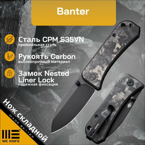Banter — складной нож от We Knife, сочетает в себе классические и неподвластные времени элементы дизайна в сочетании с современной конструкцией и материалами, что делает Banter отличным выбором для повседневного ношения. Клинок выполнен в типе drop-point из стали S35VN. Он извлекается с помощью шпенька, на обухе у рукояти имеется рифление. За фиксацию клинка в открытом положении отвечает замок Liner-lock. В осевом узле установлен керамический шарикоподшипник.