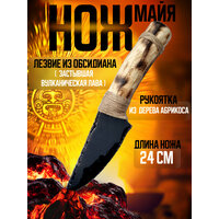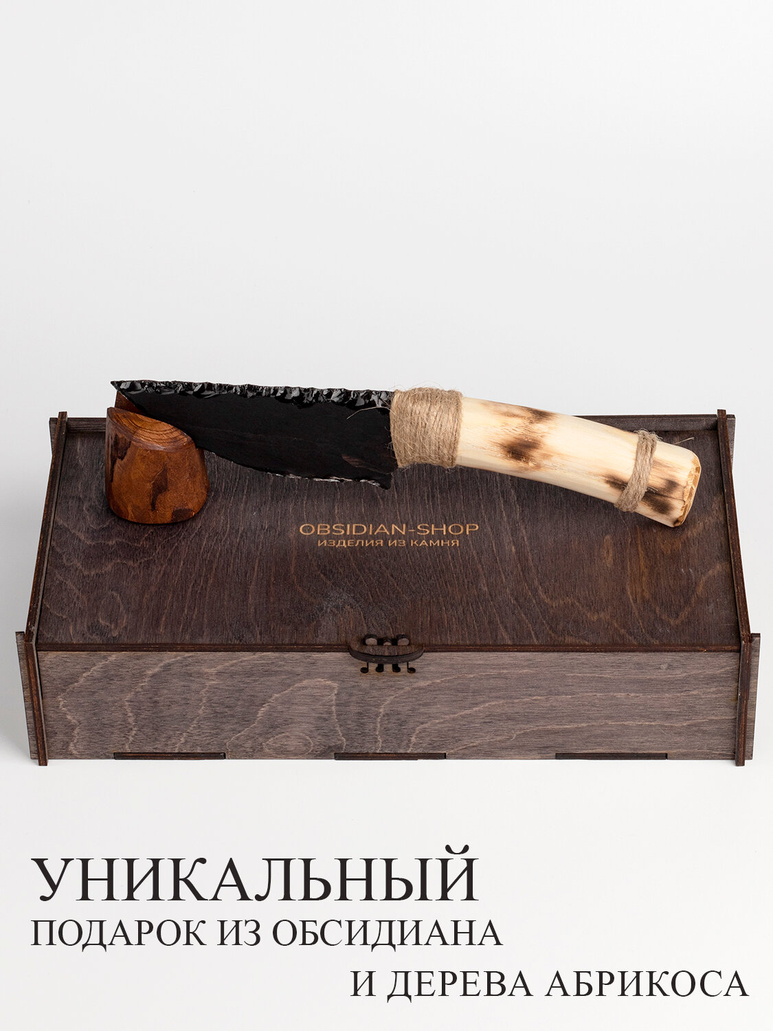 Нож является авторской работой и сделан полностью вручную. Лезвие ножа изготовлено из обсидиана - застывшей вулканической лавы, а рукоятка из абрикосового дерева с декоративным обжигом.