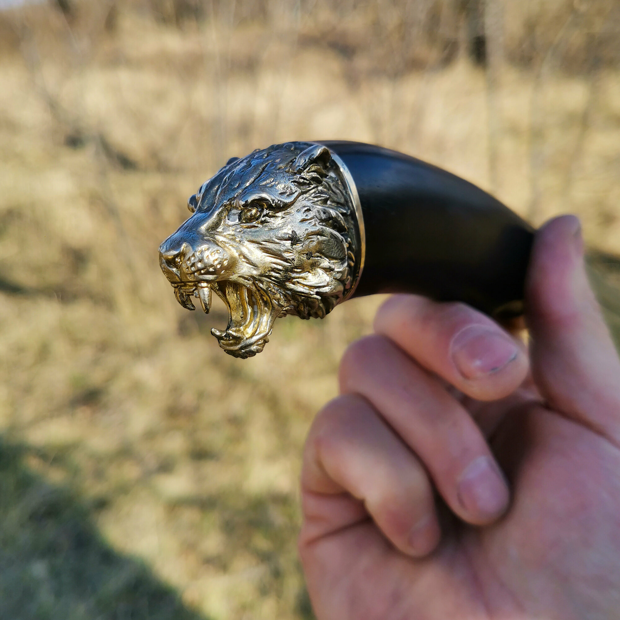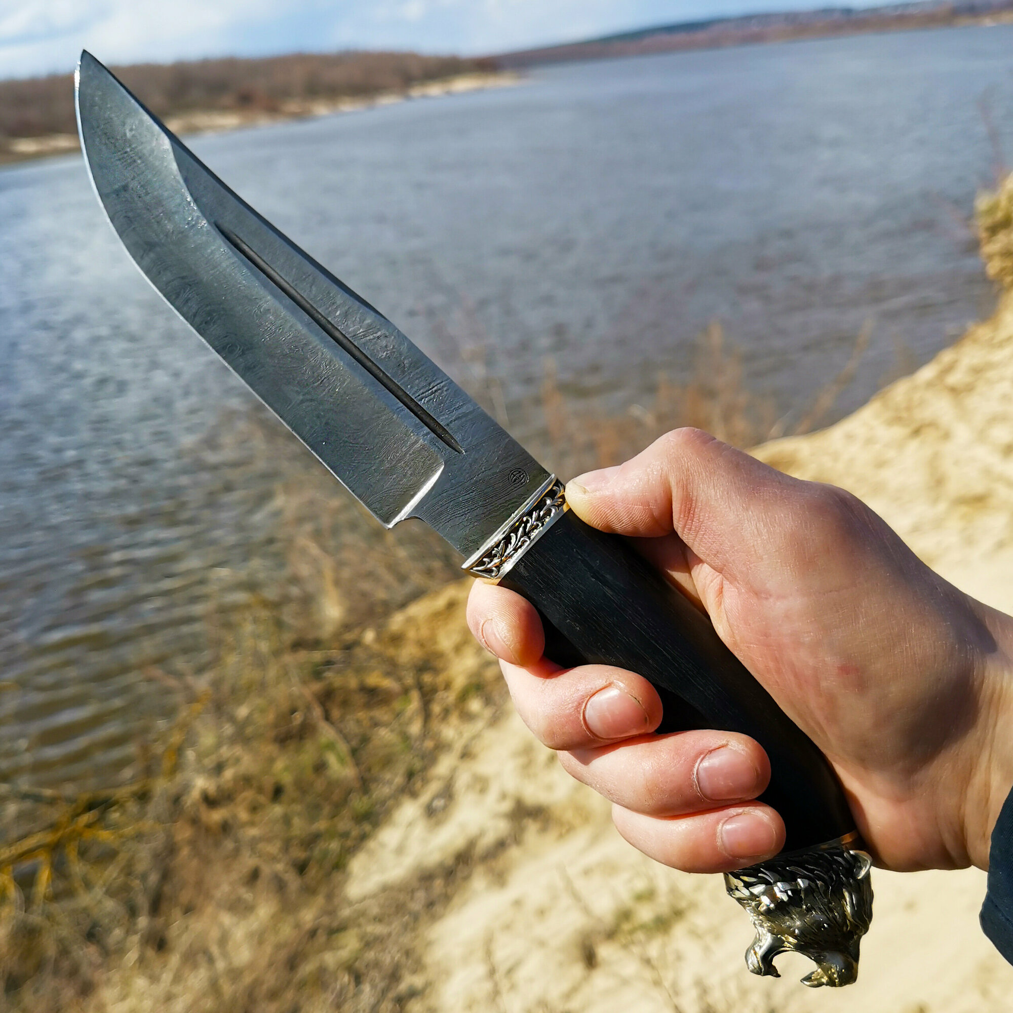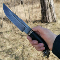 Нож "Таёжный" из дамасской стали с долами на клинке и литьём из мельхиора (основание тигр), рукоять граб Длина клинка, мм.170,0 Ширина клинка, мм.40,0 Общая длина, мм.290,0-300,0 Толщина обуха, мм.3,5-4,5 Длина рукояти, мм.120,0-130,0 Твёрдость клинка, ед. HRC.60,0-62,0 Пакет дамаска ШХ15+ХВГ+У8А Клинок изготовлен из дамасской стали, 350-400 слоёв. Спуски клинка отшлифованы вручную вогнутой линзой и имеют долы с обеих сторон. В качестве материала для рукояти использован морёный граб. Больстер и основание в виде тигра выполнены из мельхиора. Нож идёт вместе с ножнами из натуральной кожи с фиксированным и независимым подвесом.