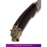 Охотничий нож из кованной стали 95х18 ручной работы. Каждый нож изготавливается вручную. Из-за этого длина и толщина клинка и рукоятки у каждого ножа могут отличаться на несколько миллиметров от заявленных в описании. Основные характеристики ножа: Длина клинка: 135 мм. - Материал рукоятки: Венге/Латунь художественное литье. - Длина рукоятки : 125 мм. - Толщина обуха:3.1 - 3.5 мм. - Ширина клинка: 34 мм. - Твердость стали: 59 HRC. - Комплектация: Нож, кожаные ножны, картонная коробка. Сталь 95х18 идеально подходит для охоты, рыбалки, туризма и ошкуривания дичи. Сталь 95х18 не боится влаги. Долго держит заточку. В комплекте идут кожаные ножны с рисунком. Ножны фиксируются на свободном подвесе на ремень. Кованая сталь 95х18 относится к категории мягких сталей, считается одним из лучших материалов для изготовления ножей. Заходите в наш магазин, чтобы ознакомиться с остальным ассортиментом нашего бренда.