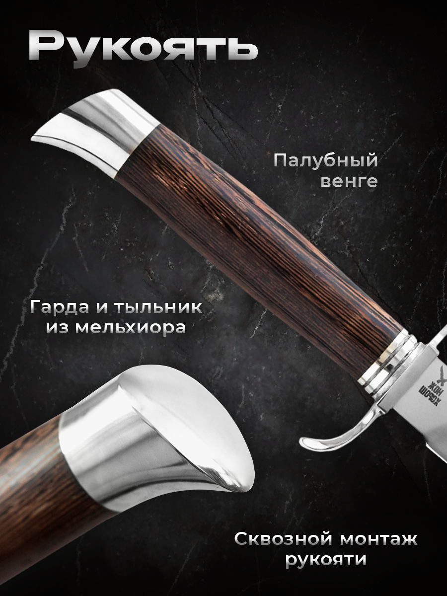 Универсальный туристический нож финка НКВД - идеальный спутник для любителей активного отдыха и ценителей качественного снаряжения. Отличается надежностью и прочностью благодаря своей конструкции и материалам изготовления. Тактический нож Финка с бритвенно-острой заточкой от компании Нож хорош сделан с исторической точностью по чертежу 1934 года. Кованый клинок охотничьего ножа изготовлен из высококачественной нержавеющей стали марки 95Х18, отличающейся повышенной износостойкостью и устойчивостью к коррозии. Деревянная рукоять выполнена из палубного венге, приятна на ощупь и обеспечивает надежный хват даже в сложных условиях. Тыльник и гарда сделаны из качественной нержавеющей стали. Нож прекрасно справится даже с самыми твёрдыми материалами. Лезвие не ржавеет и достаточно просто точится благодаря углу заточки в 25 градусов. В комплекте идет чехол из натуральной кожи буйвола, что делает транспортировку и хранение ножа безопасными. Внимание! Ножны могут быть как черного, так и коричневого цвета. Выбрать цвет при заказе нельзя. Туристический охотничий нож не является холодным оружием, что подтверждает сертификат. Многофункциональный нож подходит как для повседневного использования в быту, так и для экстремальных условий охоты, рыбалки и туризма. Стильный внешний вид финки позволяет использовать его не только как инструмент, но и как оригинальный подарок для настоящих мужчин на День рождение, Новый год, 23 февраля. В подарочной коробке нож будет запоминающимся и ценным подарком для мужа, брата или друга. Этот туристический нож станет отличным выбором для тех, кто ценит качество, надежность и универсальность инструмента.