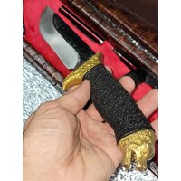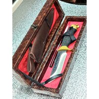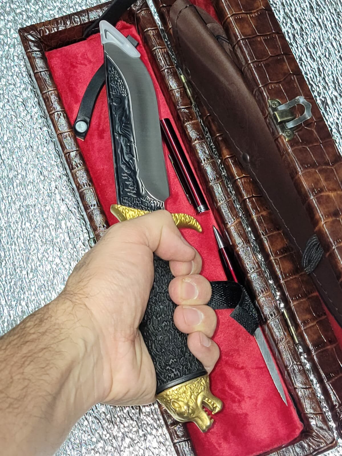 Купить Нож туристический разделочный черный Волк в чехле ножнах и подарочный кожаный футляр , ручка нож красная . (Сталь 65х13; модель 8 ) с доставкой по всей России.