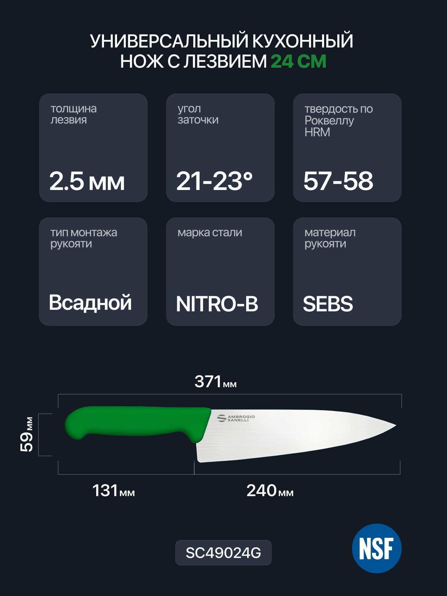 Нож универсальный 24 см поварской Sanelli Ambrogio SC49024G / зеленая ручка / профессиональный: сравнение цен, характеристики, фото, актуальное наличие и цены.