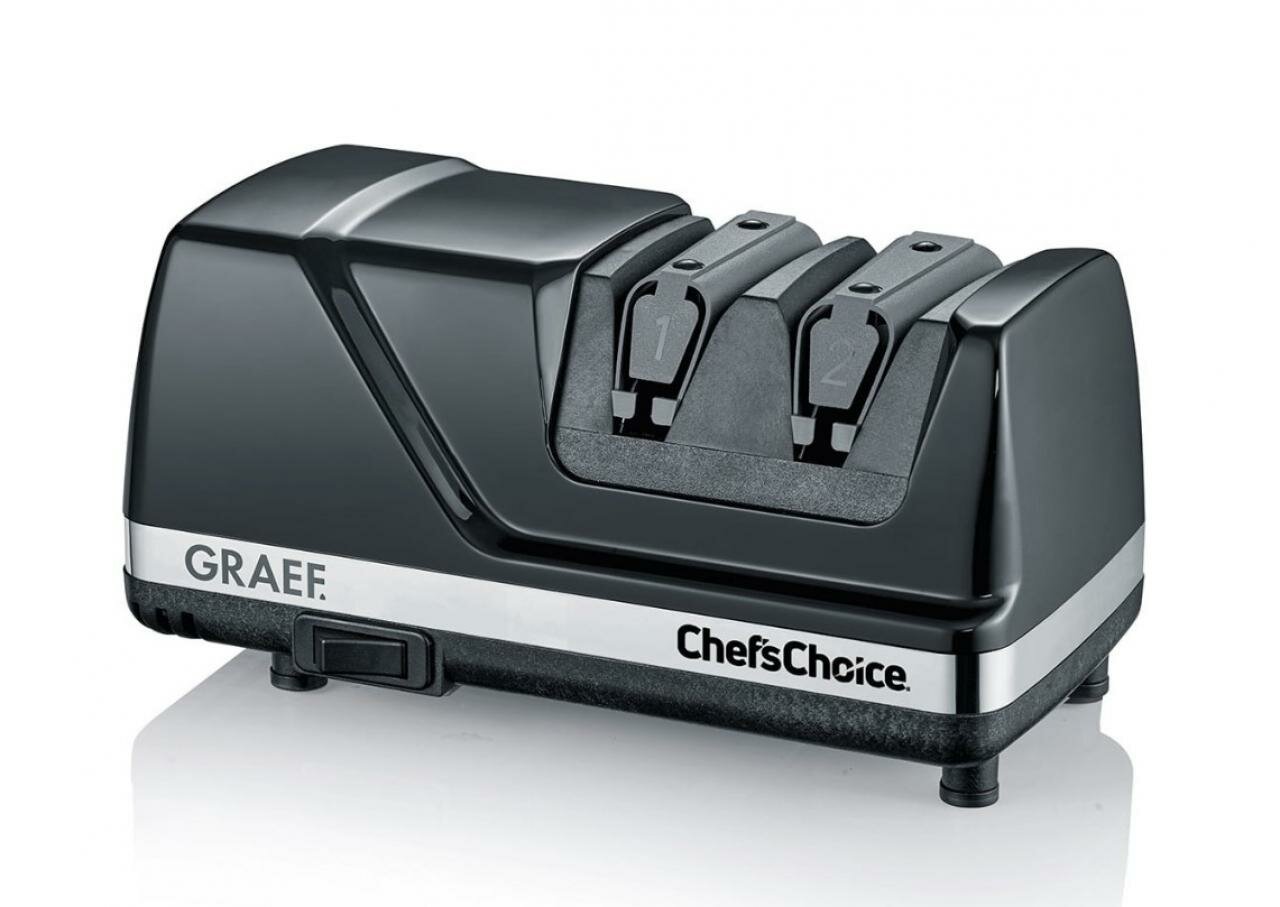 — Точилки для ножей GRAEF (кроме CC80) оснащены очень точными направляющими для ножей любого вида. Таким образом, лезвие затачивается намного точнее и «острее», чем у аналогичных устройств. — На дисках наших электрических точилок используют алмазную пыль. Диски вращаются намного медленнее по сравнению с другими точилками. Это приводит к меньшему трению о сталь ножа, и, соответственно, меньшему истиранию лезвия. — Керамический диск для финишной шлифовки/полировки в конце процесса заточки работает очень аккуратно по сравнению с другими точилками и так же практически не стирает лезвие ножа.