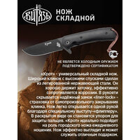 «Крот» - универсальный складной нож. Широкий клинок с высокими спусками сделан из прочной нержавеющей стали. Он хорошо держит заточку, эффективно сопротивляется коррозии. В рукояти скрывается надежный замок «liner-lock», страховка от самопроизвольного закрытия клинка. Нож легко открывается одной рукой благодаря специальному выступу «флипперу». В открытом виде он также выполняет роль одностороннего упора для защиты пальцев. «Крот» идеально подойдет на роль городского ножа ежедневного ношения.