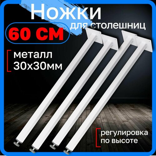 Набор 4 штуки ножек для столов длиной 60 см белого цвета с регулировкой по высоте. Изготовлены из профильной трубы 3 см на 3 см. Сверху каждой ножки площадка для крепления к столешнице 10 см на 10 см с 4 отверстиями. В комплекте мебельный еврошуруп длиной 11 мм - для ДСП и ЛДСП.