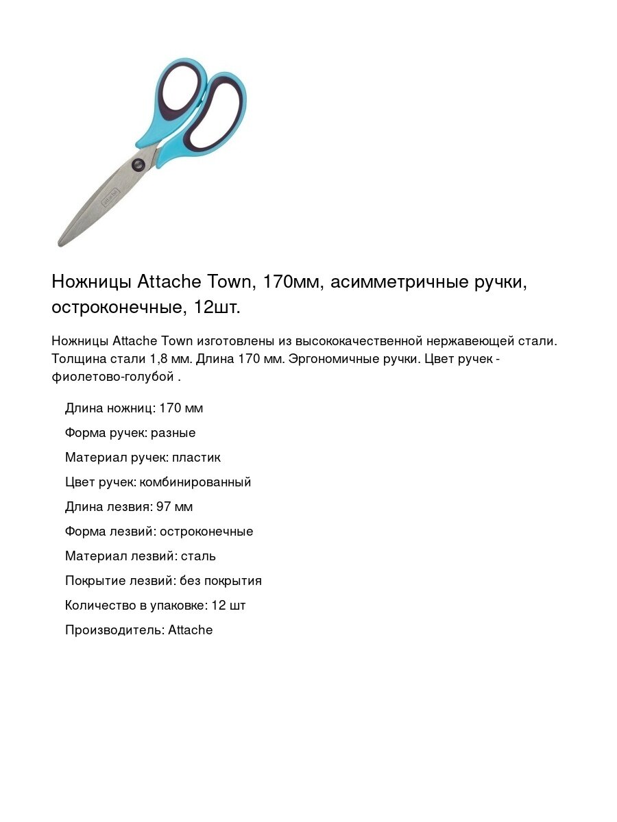 Купить Ножницы Attache Town, 170мм, асимметричные ручки, остроконечные, 12шт. с доставкой по всей России. Ножницы Attache Town, 170мм, асимметричные ручки, остроконечные, 12шт.: сравнение цен, характеристики, фото, актуальное наличие и цены.