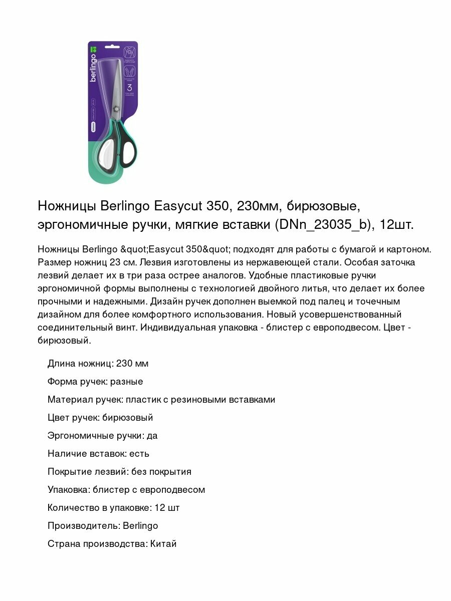 Купить Ножницы Berlingo Easycut 350, 230мм, бирюзовые, эргономичные ручки, мягкие вставки (DNn_23035_b), 12шт. с доставкой по всей России.