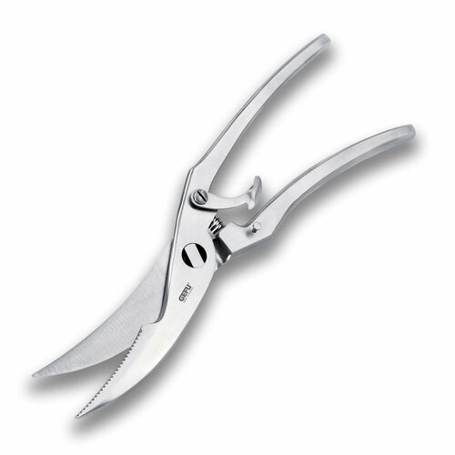 Артикул: GF12610. Классификатор : Кухонные аксессуары. Классификатор : Кухонные и хозяйственные ножницы. Тип : Кухонные и хозяйственные ножницы. Материал : Нержавеющая сталь. Страна изготовитель : Германия . Покрытие или обработка : Сатинирование (матирование). Длина (см) : 28.70. Компания производитель : GEFU GmbH, Braukweg 28, 59889 Eslohe, Deutschland. Назначение : Ножницы для птицы. GEFU – крупный немецкий производитель кухонной утвари и разнообразных аксессуаров, основанный двумя братьями Функе в 1943 году. За более чем 70 лет бренд завоевал уважение не только простых хозяек, но и профессиональных поваров в Европе и за ее пределами. Название бренда стало плотно ассоциироваться с безупречным немецким качеством, функциональностью и долговечностью. Вся продукция бренда производится исключительно из проверенных, сверхпрочных и абсолютно безопасных материалов, а на всех этапах производства осуществляется строжайший контроль качества. Изделия компании были неоднократно удостоены престижных дизайнерских премий: Reddot design award, German design award, DesignPLUS, Kucheninnovation des Jahres и др. Высочайшее качество, инновационный дизайн и высокая производительность делают продукцию GEFU лучшим выбором потребителя на рынке кухонных инструментов. Коллекция кухонных аксессуаров представлена широким ассортиментом инновационных товаров, которые облегчат приготовление блюд. Продуманные функциональные характеристики всей продукции GEFU не только избавят Вас от проблем, с которыми Вы зачастую сталкиваетесь во время готовки, но и вдохновят на открытие в себе навыков профессионального шеф-повара с безграничной фантазией. Ножницы используются для разрезания на порции запеченной или приготовленной иным способом птицы любых размеров – от мелкой дичи до крупных индеек. Особая форма ножниц позволяет аккуратно разрезать птицу в любых вариациях без боязни испачкать руки. При нарезании порционных кусков вам останется только сжимать ручки, а расправляются они сами. Специальный фиксатор делает хранение ножниц совершенно безопасным.