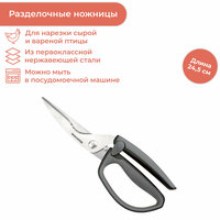 Удобные ножницы для легкого разделывания замороженной, охлажденной и запеченной птицы. Лезвия специальной формы с микрозубчиками отлично подходят для удобного разрезания сырой кожи и крупных костей. Идеально эргономичная ручка не скользит в ладони, что позволяет безопасно разделать птицу. Изготовлено из первоклассной ножевой стали. Можно мыть в посудомоечной машине. 5-летняя гарантия.