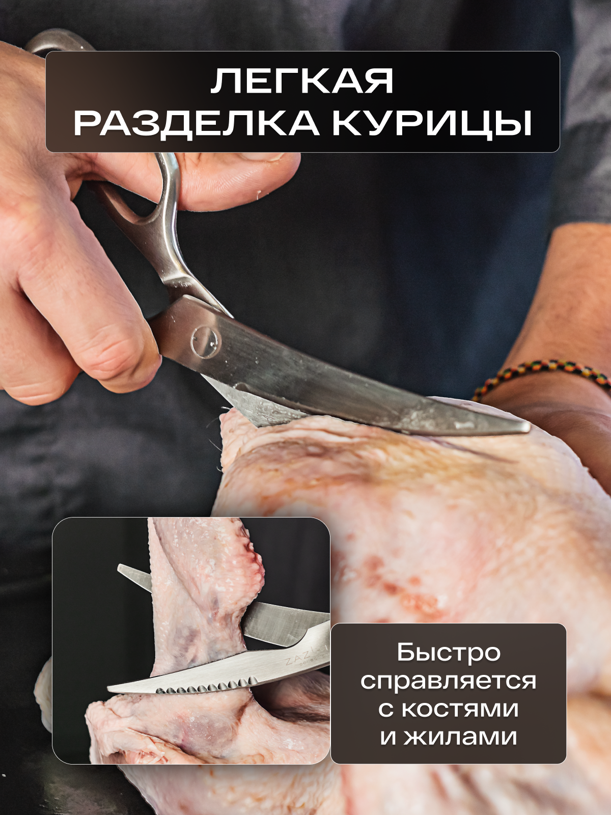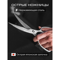 Универсальный дизайн позволяет использовать их для различных задач на кухне, от обработки курицы и резки овощей до открытия бутылок и колки орехов с помощью специального отверстия в ручке ножниц.