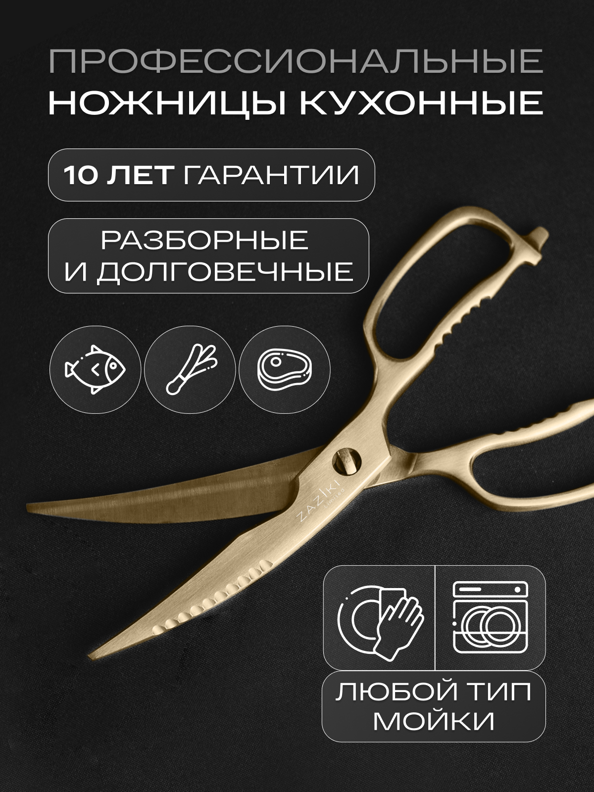 Ножницы кухонные универсальные Zaziki для птицы и рыбы, металлические разборные для нарезки с орехоколом, золотые: сравнение цен, характеристики, фото, актуальное наличие и цены.