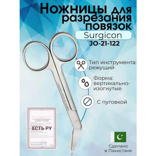 Ножницы медицинские для разрезания повязок с пуговкой горизонтально-изогнутые, длиной 180 мм производства компании Surgicon в Пакистане. Предназначены для многоразового использования в операционных, хирургических отделениях и травматологии. Изгиб лезвий позволяет удобно удерживать различные материалы и манипулировать ими во время процедуры.