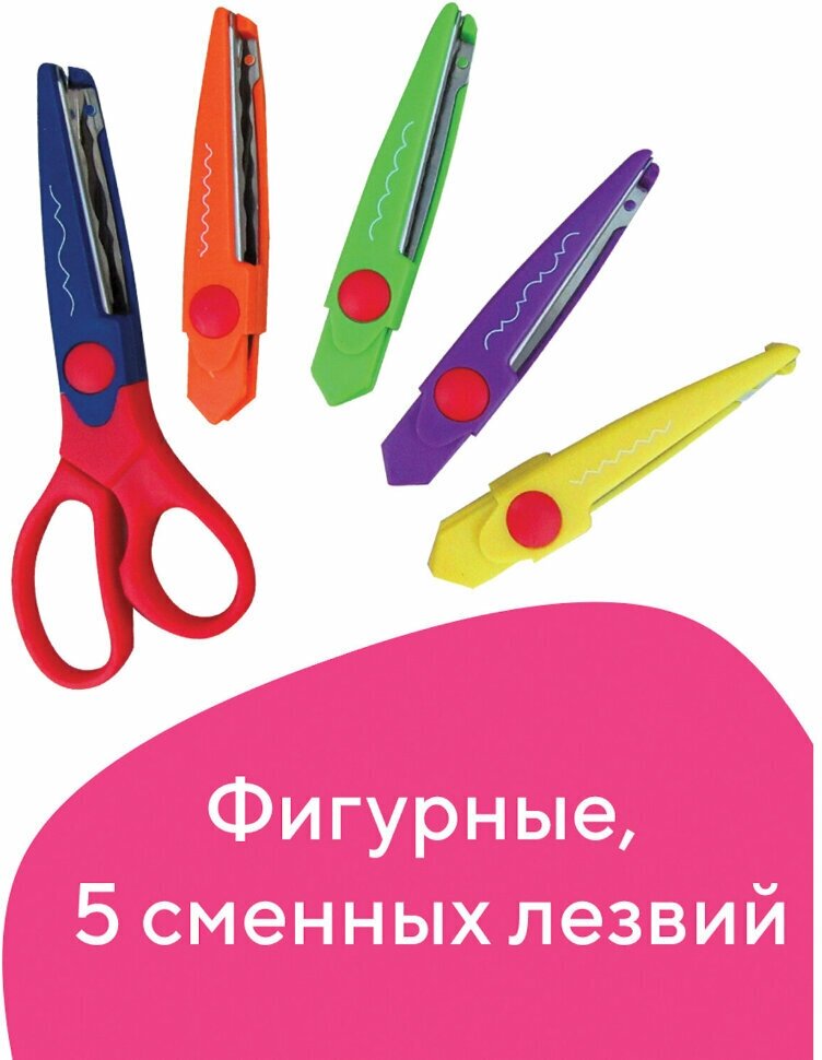 Особенностью этих ножниц является наличие 5 сменных фигурных лезвий, которые позволяют создавать разнообразные узоры на бумаге и картоне. Яркий пластиковый корпус и металлические лезвия из нержавеющей стали с закругленными концами делают эти ножницы безопасными для использования детьми.
