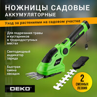Ножницы садовые аккумуляторные DEKO DKGS3.6 - многофункциональный инструмент с 2 насадками, используемый для финишной обработки газона и ухода за кустами. Для контроля уровня заряда предусмотрен светодиодный индикатор. Замена насадок производится без применения дополнительного инструмента. Оснащен кнопкой блокировки от случайного включения.