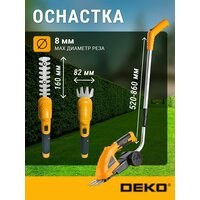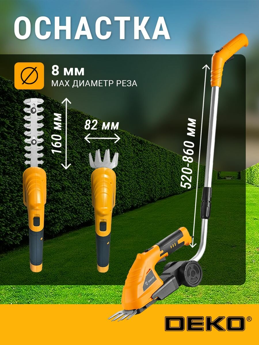 Ножницы садовые аккумуляторные DEKO DKGS8 PRO — многофункциональный инструмент, используемый для финишной обработки газона и ухода за кустами. Удлинительная ручка с органами управления позволяет работать, не наклоняясь.