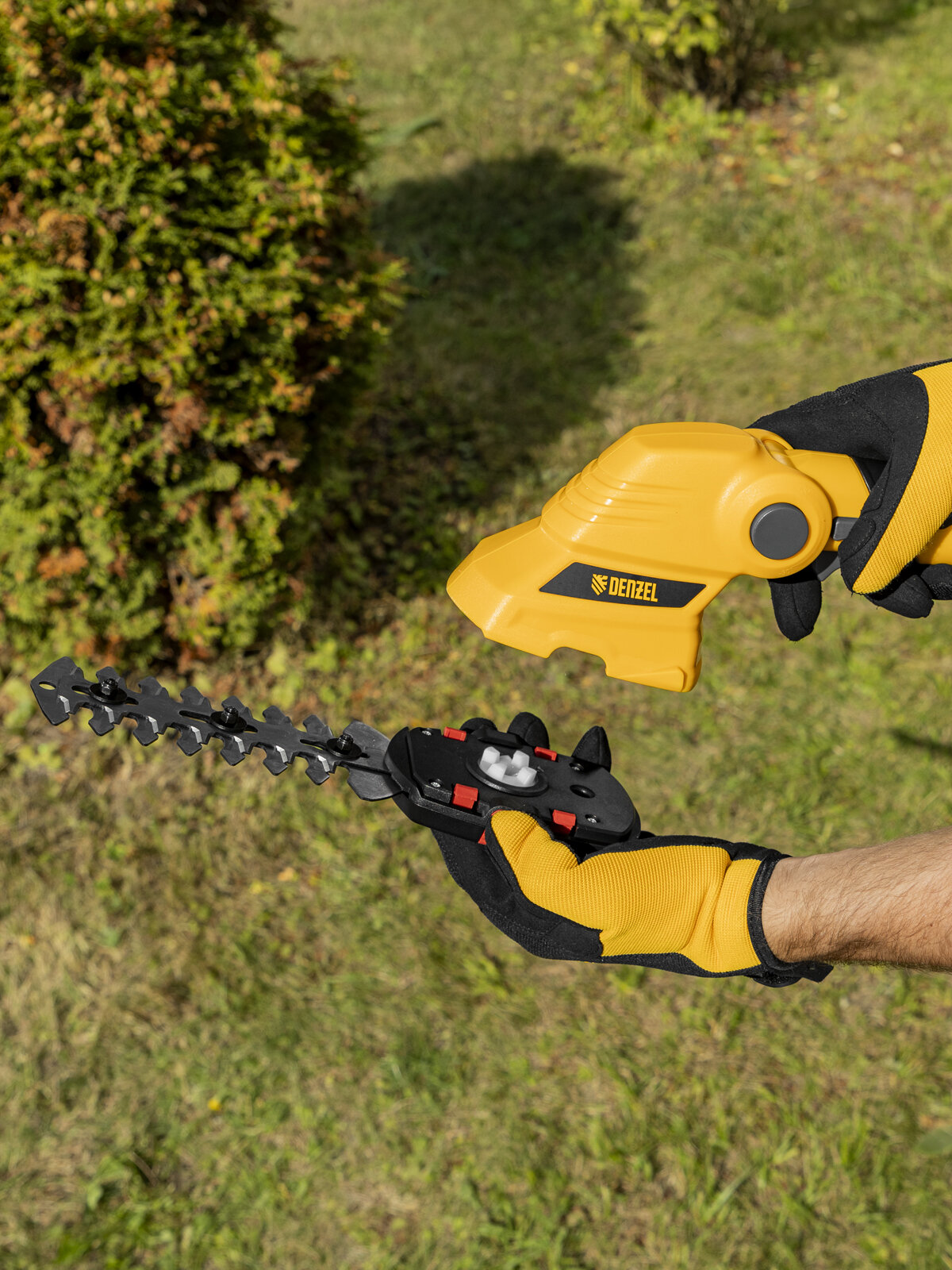 Аккумуляторные садовые ножницы (со встроенным аккумулятором) - 1 шт. Режущий модуль для травы быстросъемный - 1 шт. Режущий модуль для кусторезов быстросъемный - 1 шт. Зарядное устройство - 1 шт. Руководство пользователя - 1 шт.