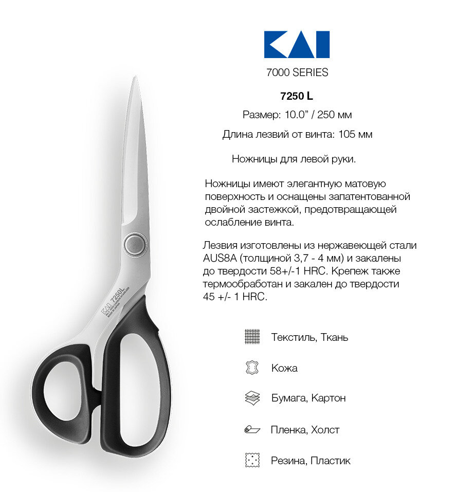 Купить Ножницы закройные KAI 7250 L (для левшей), 25 см с доставкой по всей России. Ножницы закройные KAI 7250 L (для левшей), 25 см: сравнение цен, характеристики, фото, актуальное наличие и цены.
