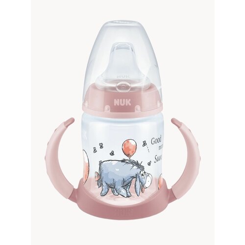 NUK First Choice обучающая бутылочка с ручками: делает простым обучение самостоятельному питью благодаря своей оптимальной форме. C насадкой для питья из силикона и съемными ручками для детей 6-18 месяцевНепротекающая насадка для питья изготовлена из мягкого, приятного на ощупь силикона. Силикон - это прочный, эластичный и очень мягкий материал, устойчивый к высоким температурам, обладающий нейтральным вкусом. Он не содержит вредных субстанций, может подвергаться кипячению, не имеет запаха, прозрачен и имеет гладкую поверхность. Встроенная система NUK Air System выравнивает давление в бутылочке и способствует снижению колик благодаря меньшему заглатыванию воздуха. Нескользящие ручки эргономической формы. Еще одной важной деталью является изображение забавного Винни Пуха - лучшего друга трудно себе пожелать. Так думают не только Пятачок, Тигра и Иа-Иа, но и каждый малыш во всем мире. Поэтому ваш ребенок будет счастлив видеть Винни Пуха и его друзей на своей обучающей бутылочке NUK First Choice. Пластиковая бутылочка емкостью 150 мл имеет широкое горлышко и поставляется вместе с завинчивающимся кольцом, закупоривающим диском, защитным колпачком и удобными ручками. Эти элементы легко снимаются с бутылочки - удобно для мытья и приготовления пищи. NUK First Choice Обучающая бутылочка может комбинироваться со всеми продуктами линейки NUK First Choice. Индикатор температуры NUKИндикатор температуры, расположенный в измерительной шкале, дает уверенность в том, что содержимое бутылочки не окажется слишком горячим. Если содержимое будет слишком горячее, индикатор меняет свой цвет на белый. Нормальная температура пищи 37°C, что соответствует голубому цвету шкалы индикатора. Важно: Шкала температурного контрольного NUK предназначен для дополнительной проверки. Поэтому, пожалуйста, всегда проверяйте температуру содержимого бутылочки, прежде чем давать пищу ребенку.