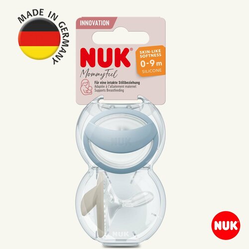 NUK MommyFeel соска-пустышка из силикона для комфортного сочетания с грудным вскармливанием, для детей 0-9 месяцев, 2 штуки в упаковке. Уникальная форма пустышки для детей в период грудного вскармливания. Мягкий и знакомый: очень мягкая силиконовая пустышка ортодонтической формы. Рекомендуется акушерами, консультантами по грудному вскармливанию и врачами: губы ребенка прилегают к соске, как при грудном вскармливании. Не содержит бисфенол-А, по 2 штуки в упаковке, контейнер многоразового использования. NUK MommyFeel – придает ребёнку ощущение постоянного присутствия мамыОтношения между мамой и младенцем во время кормления грудью очень нежны и бережны. Основываясь на этом, соска-пустышка NUK MommyFeel имеет особую конструкцию, которая позволяет успокоить младенца и не препятствует грудному вскармливанию. Соска из мягкого силикона имеет форму схожую с сосковым полем груди кормящей женщины. Это создает у малыша ощущение, схожее с присутствием мамы. Еще одно преимущество пустышки в том, что соска касается только губ ребенка и нежная чувствительная кожа вокруг рта остается открытой. Таким образом, соска-пустышка NUK MommyFeel не оставляет следов от давления и предотвращает появление раздражений на коже. С самого рождения дети учатся правильно захватывать сосок материнской груди во время кормления - соска-пустышка NUK MommyFeel имитирует такое же положение губ ребенка. И, конечно же, NUK MommyFeel имеет оригинальную форму соски NUK, наиболее удобную для зубов, челюсти и нёба ребенка, что делает NUK MommyFeel лучшим выбором для детей, находящихся на грудном вскармливании. Пустышку можно подвергать гигиенической обработке в микроволновой печи. Для этого наполните контейнер водой до нижней линии разметки, вставьте пустышку в контейнер соской вниз и поместите в микроволновую печь. Перед использованием пустышки внимательно ознакомьтесь с инструкцией по её применению, которая находится внутри упаковки.