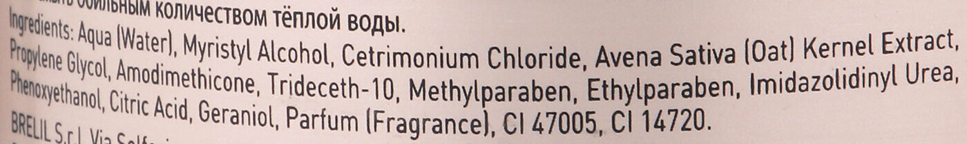 | Состав | aqua (water), merisryl alcohol, cetrimonium chloride, amodimethicone, trideceth 10, avena sativa (oat) kernel extract, imidazolidinyl urea, methylparaben, propylparaben, ethylparaben, butylparaben, isobutylparaben, phenoxyethanol, citric acid, parfum (fragrance), geraniol, c.i. 14720, c.i. 47005 (yellow 10) |
