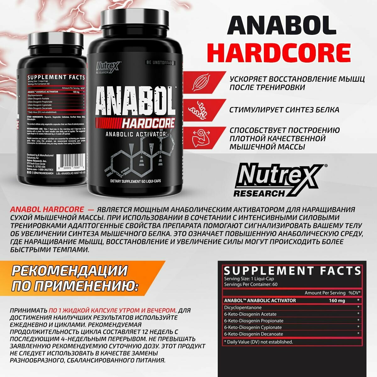 Nutrex Anabol Hardcore, Анаболический комплекс, 60 капсул, для набора мышечной массы, для силы и быстрого восстановления: сравнение цен, характеристики, фото, актуальное наличие и цены.