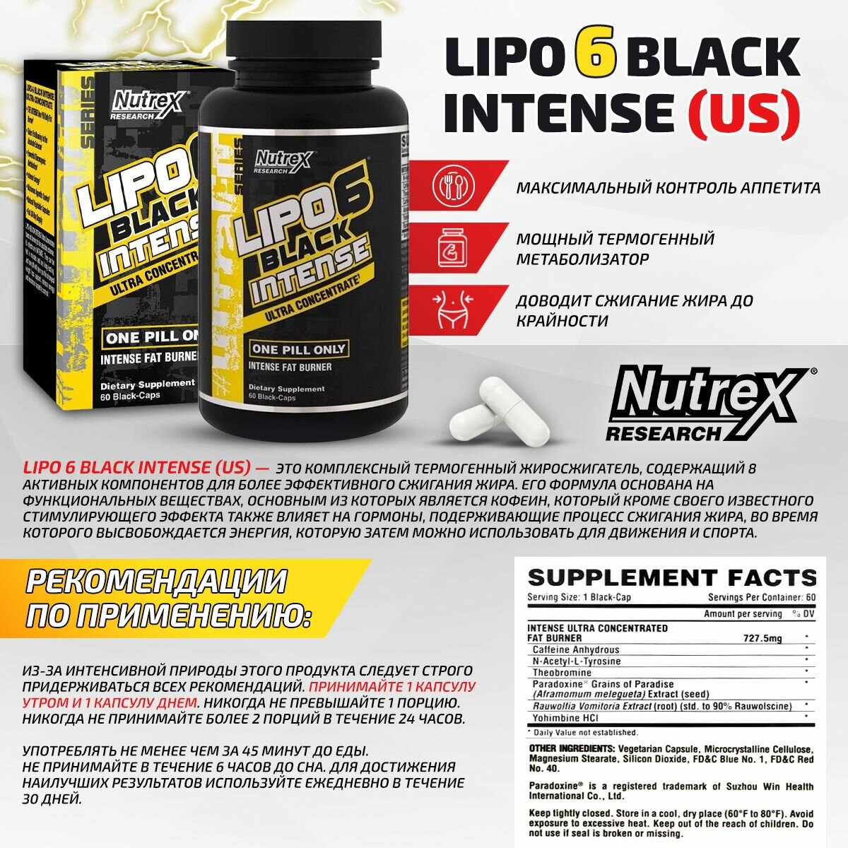 Lipo 6 Black Intense Ultra Concentrate – это комплексный термогенный жиросжигатель, содержащий 8 активных компонентов для более эффективного сжигания жира. Его формула основана на функциональных веществах, основным из которых является кофеин , который кроме своего известного стимулирующего эффекта также влияет на гормоны (катехоламины). Эти гормоны поддерживают процесс сжигания жира, во время которого высвобождается энергия , которую затем можно использовать для движения и спорта. К тому же продукт помогает поддерживать бдительность и концентрацию. Теобромин , происходящий из какао, также оказывает подобное стимулирующее действие. Также этот компонент связывают со способностью регулировать аппетит , который вы обязательно понравитесь во время похудения.