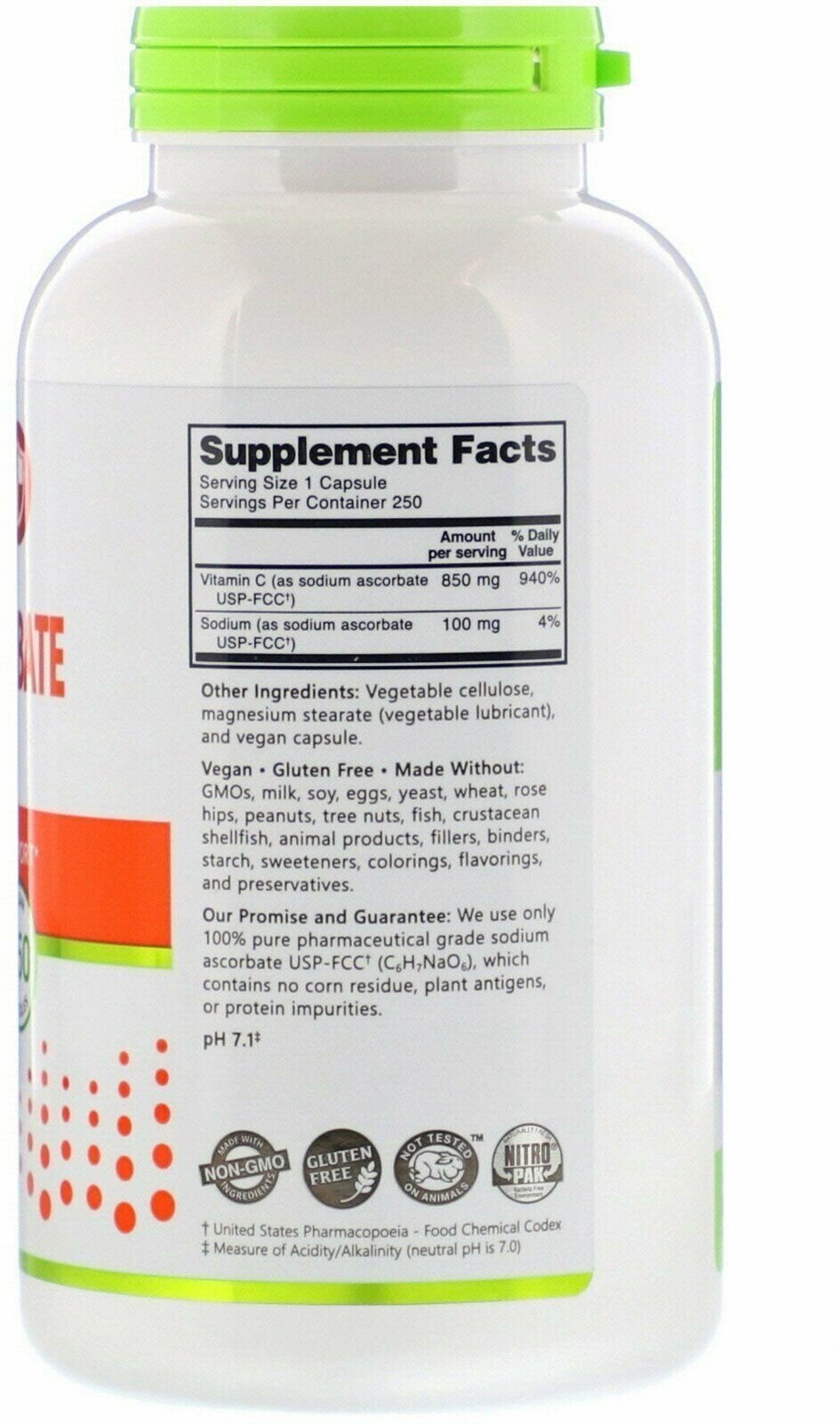 Не содержит ГМО, молока, сои, яиц, дрожжей, пшеницы, шиповника, арахиса, древесных орехов, рыбы, моллюсков и ракообразных, ингредиентов животного происхождения, наполнителей, связывающих веществ, крахмала, подсластителей, красителей, ароматизаторов, и консервантов.Мы используем на 100% чистый аскорбат натрия фармацевтической степени чистоты USP-FCC (C6H7Na06), который не содержит остатков кукурузы, антигенов растений, или белковых примесей.