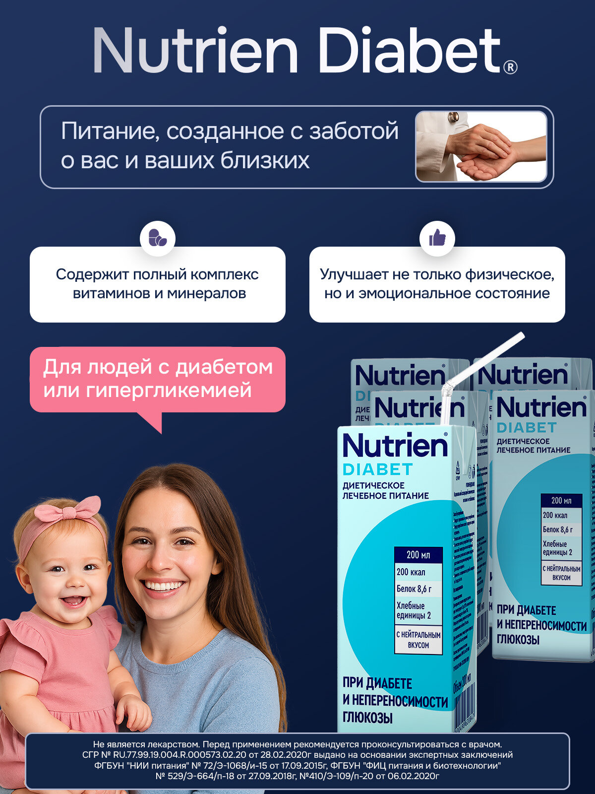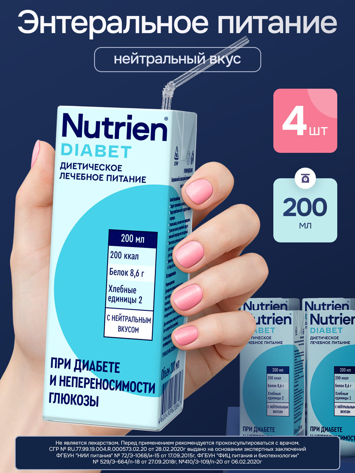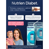 Nutrien® Diabet (Нутриэн® Диабет) 200 мл - Полноценный специализированный продукт для диетического лечебного (энтерального) питания при сахарном диабете 1 и 2 типа, с ограниченной переносимостью глюкозы и стрессиндуцированной гипергликемией, а также с различными заболеваниями, включая критические состояния. Может быть назначен пациентам с проблемами ЖКТ для нормализации микробиоты и моторики кишечника.