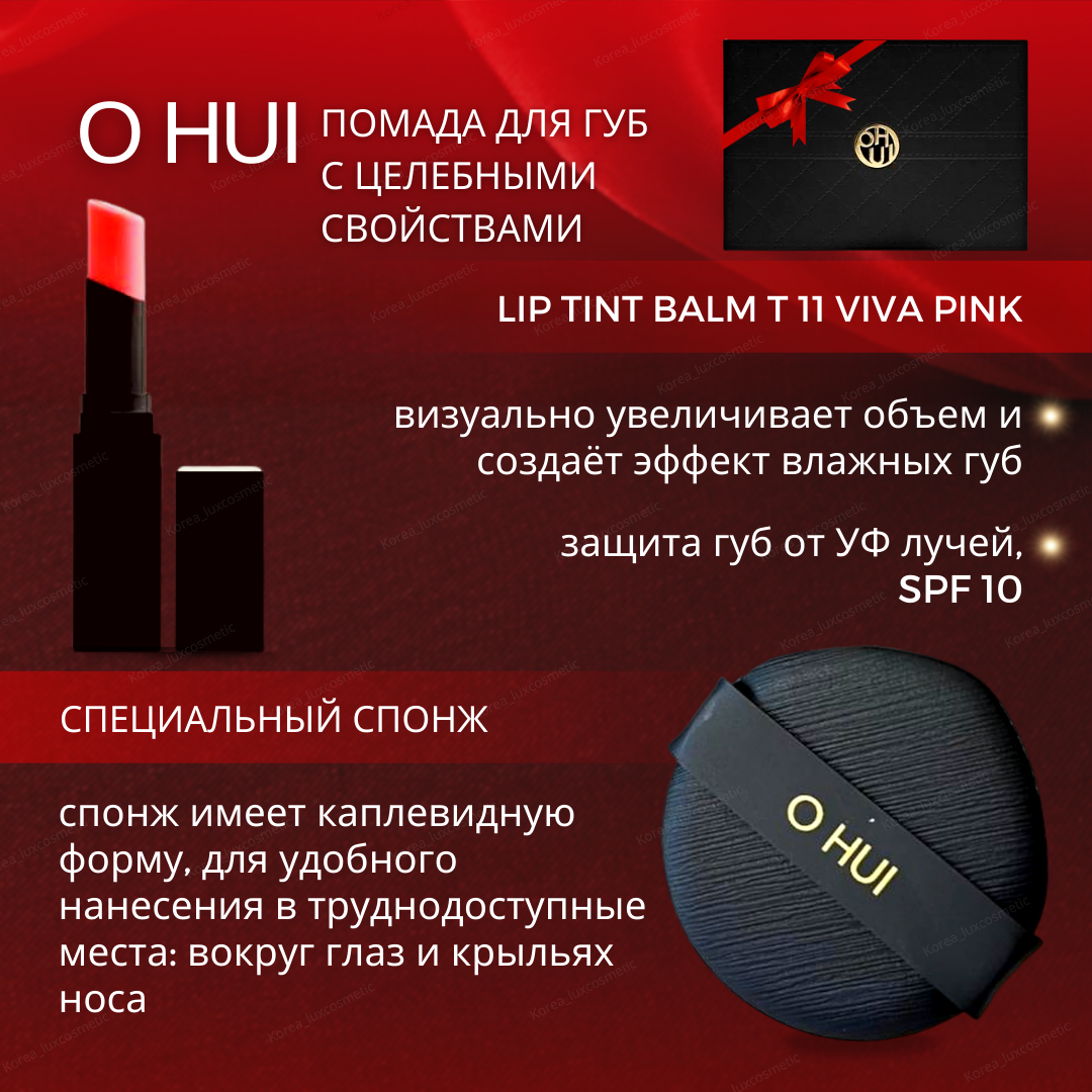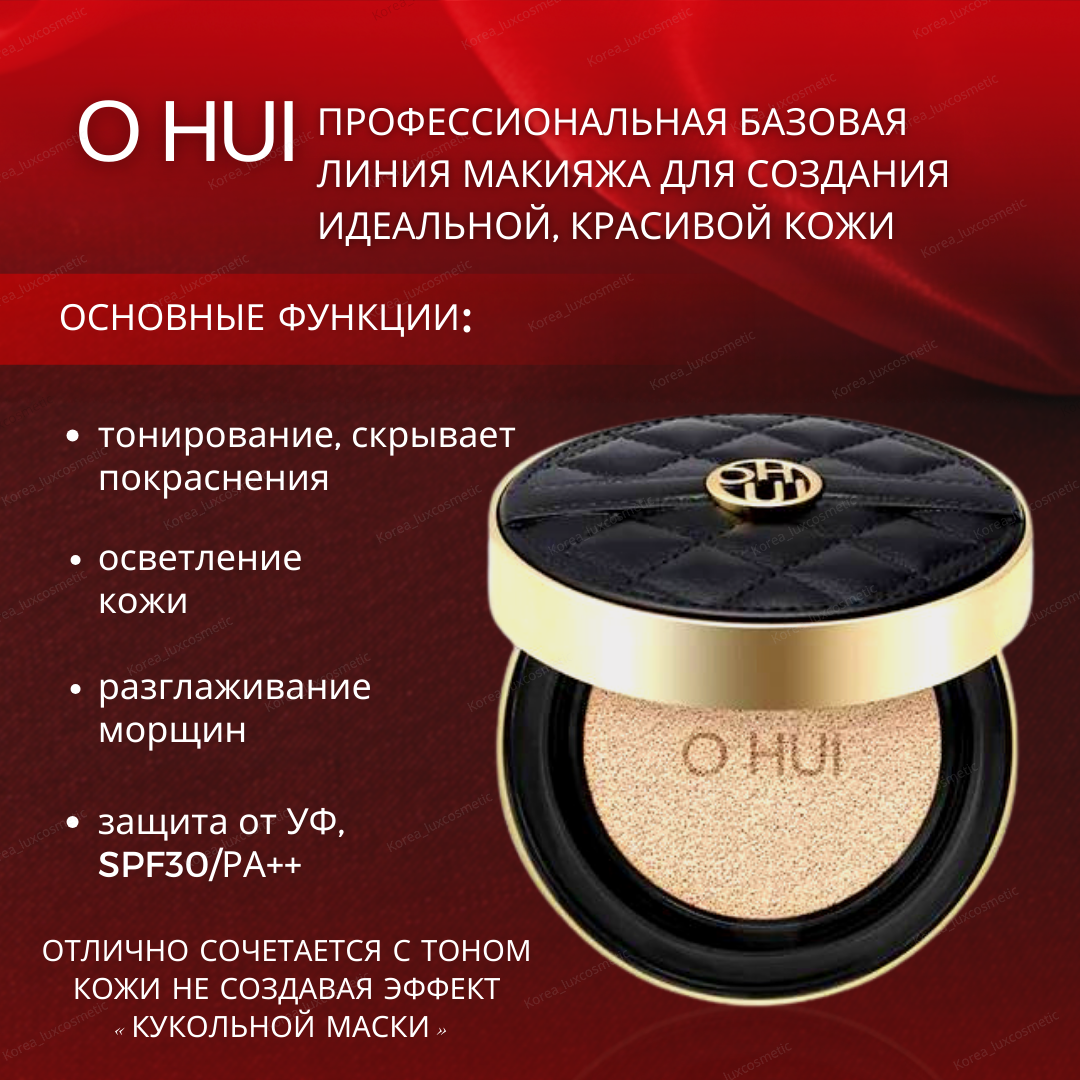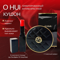 OHUI Лимитированный, антивозрастной кушон (01 тон Pink Beige) SPF 30/PA++Ultimate Cover the Couture Cushion - обладает превосходным покрытием, стойкой силой и комфортным, уходовым действием в течение длительного времени. Профессиональная базовая линия макияжа для создания идеальной, красивой кожи. Обновлённая формула содержит в себе три основных функции: защита от УФ, осветления кожи, разглаживание морщин. В составе: диметикон Руде-10, Пальмитат этиловой нуклеиновой кислоты, диоксид титана, синтетическии оторфлогофит, триметилсилоксисиликат, ниацинамид, оксид алюминия, полиметилметакрилат, 1,2- диол нуклеиновой кислоты, бутиленгликоль, Пантенол, Магнезий, калий, Кремний, фторид, гидроксид натрия, каприловая кислота. Магнезиальная сульфатная кислота, стеарат цинка, гидроксид алюминия, стеариновая кислота, экстракт мускатного ореха, экстракт огурца люфы, лимонан, желтый оксид железа, красный оксид железа. Кушон благодаря своему составу, прекрасно ложится на кожу и сливается с ней по тону. Маскирует несовершенства кожного рельефа, из-за деликатного сияния. Отлично сочетается с тоном кожи не создавая эффект «кукольной маски» на лице и видимых границ: лицо-шея. Нежнейшая текстура легко наносится ровным слоем не скатывается и не проваливается в поры, не блокирует свободное дыхание клеток эпидермиса. При нанесении веснушки, пигментация, купироз станут менее заметны. Если нужно затонировать более плотно, можно нанести втрой слой . Стойкость макияжа до 24 часов, не требуя поправления мк. К кушону прилагается фирменный, специальный спонж: верхняя сторона выполнена из мягкой эко-кожи, а сторона для набора средства из мягкого специального материала, благодаря ему, тон ложится равномерным слоем. Спонж имеет каплевидную форму, для удобного нанесения в труднодоступные места: вокруг глаз и крыльях носа. Средство содержит уровень защиты от ультрафиолета SPF30/РА++ обеспечивая защиту кожи от вредных солнечных, препятствует раннему фотостарению. К кушону прилагается губная помада, яркого цвета, с уникальным действием защитой от ультрафиолета SPF10 Комплектация: Кушон (01 тон Pink Beige)13гр SPF30/РА++ 1 сменный рефил Помада (5,5гр) Lip Tint Balm T11 Viva Pink SPF 10