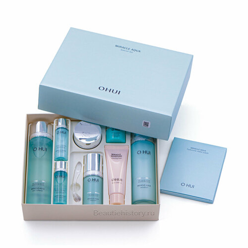 | В наборе | OHUI Miracle Aqua Skin Softener 20|150ml - интенсивно увлажняющий тонер OHUI Miracle Aqua Emulsion 20|130ml - интенсивно увлажняющая эмульсия OHUI Miracle Aqua Essence 20ml интенсивная увлажняющая эссенция OHUI Miracle Aqua Gel Cream 30 | 7 ml - крем-гель OHUI Miracle Moisture Cleansing Foam 40ml увлажняющая пенка OHUI MIRACLE AQUA Hyaluronic Water Patch 5 gx 2 patches интенсивные увлажняющие патчи |