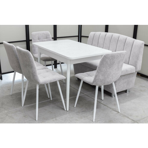 Обеденная группа состоящая из стола Ост белого цвета, кухонного дивана Альт и 4-х стульев в одинаковой светло-серой обивке.