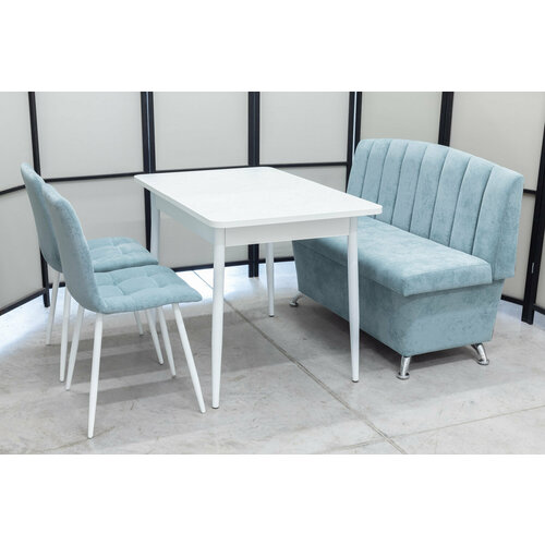 Обеденная группа состоящая из стола Ост белого цвета, кухонного дивана Альт и 2-х стульев в одинаковой светло-бирюзовой обивке.