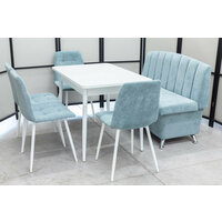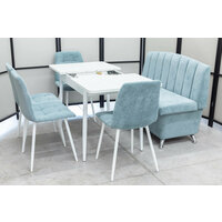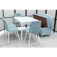Обеденная группа состоящая из стола Ост белого цвета, кухонного дивана Альт и 4-х стульев в одинаковой светло-бирюзовой обивке.