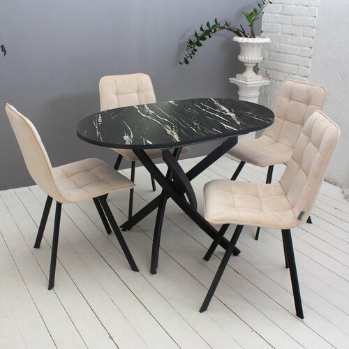 Обеденная группа Smart-3 (стол №31 и 4 стула №28) Овальный раздвижной стол в современном стиле. Металлическое основание окрашено порошковой краской, столешница - пластик. Механизм трансформации - бабочка. В сложенном виде специальная вставка (30 см) хранится под столешницей, при необходимости стол легко раскладывается до 140 см в длину. В комплекте 4 стула на металлическом каркасе цвета Черный муар с мягкими велюровыми сиденьями бежевого цвета