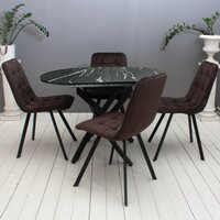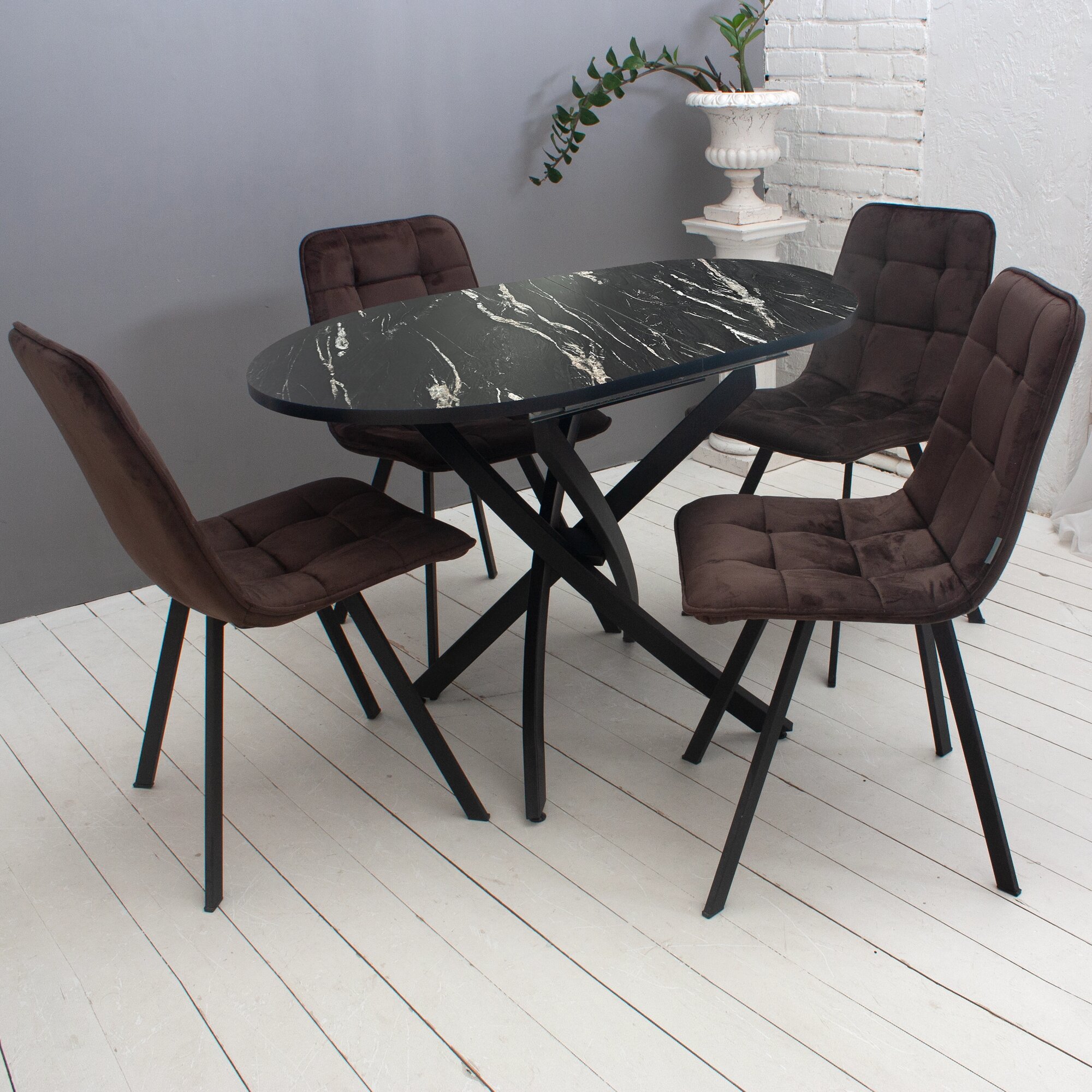 Обеденная группа Smart-3 (стол №31 и 4 стула №28) Овальный раздвижной стол в современном стиле. Металлическое основание окрашено порошковой краской, столешница - пластик. Механизм трансформации - бабочка. В сложенном виде специальная вставка (30 см) хранится под столешницей, при необходимости стол легко раскладывается до 140 см в длину. В комплекте 4 стула на металлическом каркасе цвета Черный муар с мягкими велюровыми сиденьями коричневого цвета