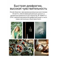 Компактный и лёгкий Canon RF 45mm f/1.2 STM — доступный фикс-объектив с очень высокой светосилой f/1.2 и универсальным фокусным расстоянием 45 мм. Идеально подходит для прогулочной съёмки или работы в студии, обеспечивая чрезвычайно малую глубину резкости и красивое, выразительное боке. Благодаря широкой диафрагме и среднему фокусному расстоянию, этот объектив отлично подходит для портретов, лайфстайл-съёмки и съёмки при слабом освещении, создавая мягкие изображения с плавным переходом резкости. Двигатель STM обеспечивает тихую и плавную работу автофокуса с возможностью ручной корректировки. Оптическая схема включает одну асферическую линзу, уменьшающую сферические аберрации и искажения.