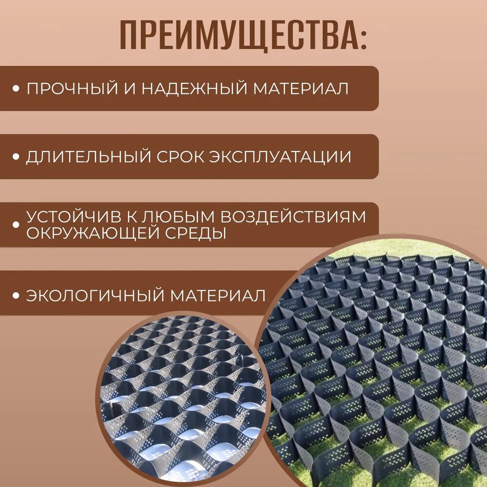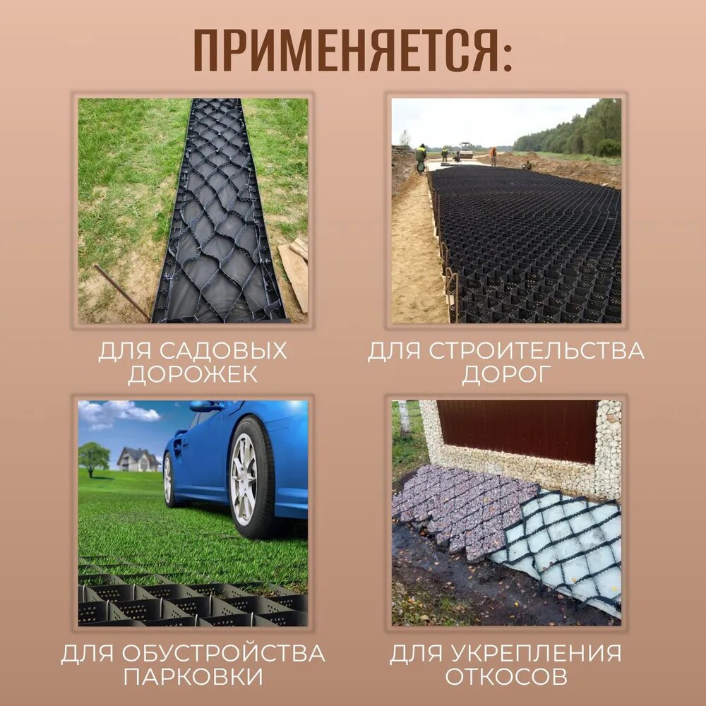 Объемная георешетка имеет следующие размеры: длина - 5,7 м, ширина - 3,15 м, количество в упаковке - 1.0.