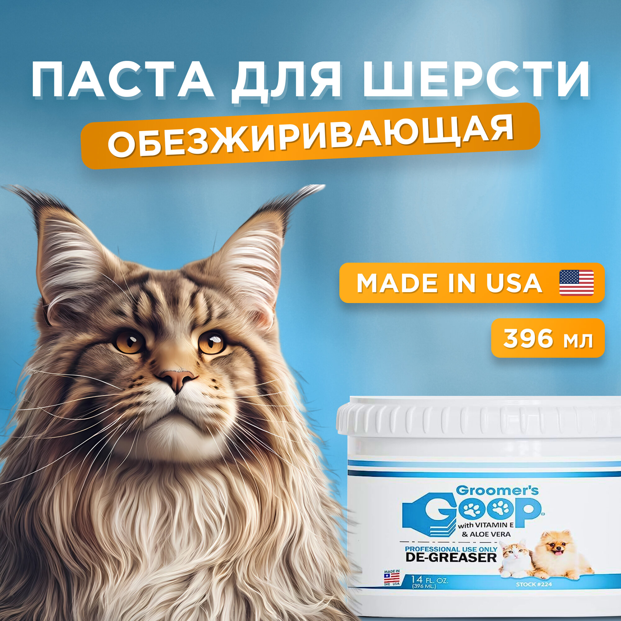 Groomer`s Goop Degreaser - Обезжиривающая паста для шерсти - это профессиональный уход за грязной, жирной, сальной шерстью кошек и собак. Это особенно актуально для пород кошек с длинной шерстью (персидская, мейн-кун, сибирская, норвежская лесная, хайленд-фолд, селкирк-рекс). Ничто не работает лучше, чтобы удалять жир, сало и стойкие загрязнения, оставляя шерсть чистой, блестящей. Специально разработанная формула Groomer`s Goop позволяет удалять даже самые стойкую грязь , особенно если Ваша кошка или собака имеет сальные участки шерсти, а также желтизну в белых и светлых областях, жирный хвост Способ применения : возьмите достаточно большое количество пасты и вотрите в сухую шерсть, уделяя особое внимание в области груди, позади ушей, основание хвоста. Оставьте на 5 минут для воздействия. Осторожно используйте пасту в области глаз, рта и ушей. Промойте теплой водой и нанести Groomer`s Goop Glossy Coat Pet Shampoo непосредственно на шерсть, несколько минут массируя ее, затем неоднократно промываете теплой водой.
