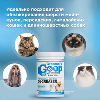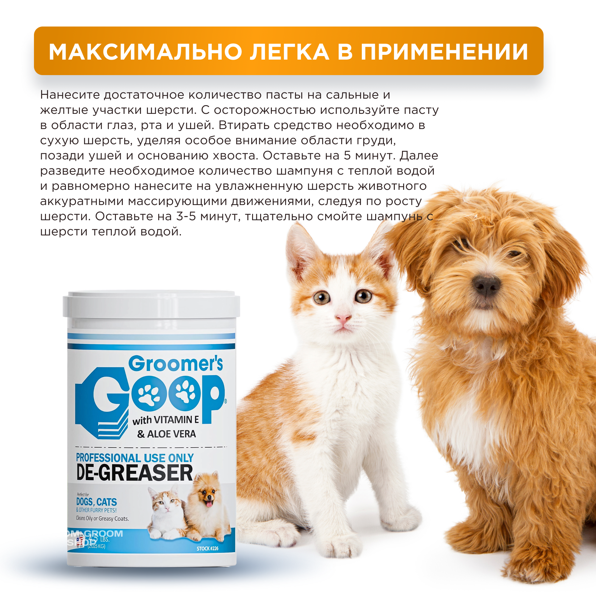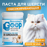 Groomer`s Goop Degreaser - Обезжиривающая паста для шерсти - это профессиональный уход за грязной, жирной, сальной шерстью кошек и собак. Это особенно актуально для пород кошек с длинной шерстью (персидская, мейн-кун, сибирская, норвежская лесная, хайленд-фолд, селкирк-рекс). Ничто не работает лучше, чтобы удалять жир, сало и стойкие загрязнения, оставляя шерсть чистой, блестящей. Специально разработанная формула Groomer`s Goop позволяет удалять даже самые стойкую грязь. Если Ваша кошка или собака имеет сальные участки шерсти, а также желтизну в белых и светлых областях, жирный хвост - возьмите достаточно большое количество пасты и вотрите в сухую шерсть, уделяя особое внимание в области груди, позади ушей, основание хвоста. Оставьте на 5 минут для воздействия. Осторожно используйте пасту в области глаз, рта и ушей. Промойте теплой водой и нанести Groomer`s Goop Glossy Coat Pet Shampoo непосредственно на шерсть, несколько минут массируя ее, затем неоднократно промываете теплой водой.