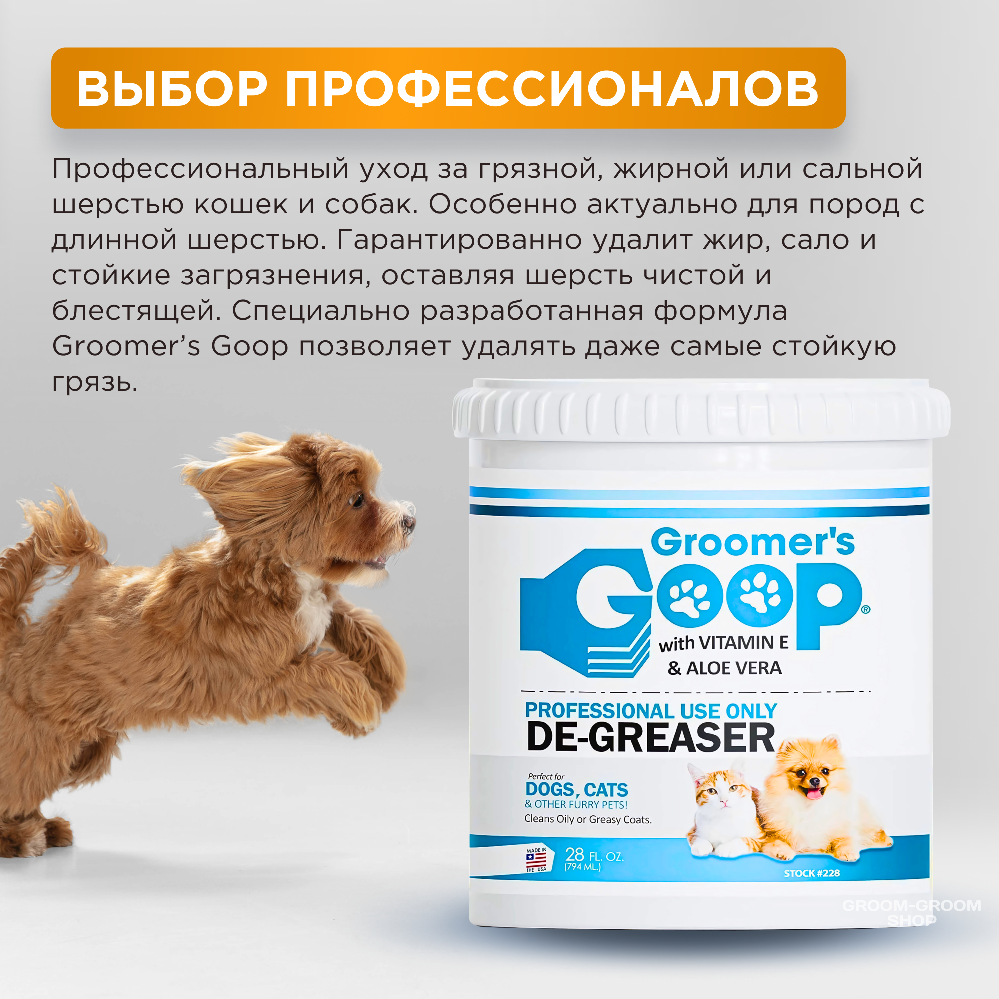 Groomer`s Goop Degreaser - Обезжиривающая паста для шерсти - это профессиональный уход за грязной, жирной, сальной шерстью кошек и собак. Это особенно актуально для пород кошек с длинной шерстью (персидская, мейн-кун, сибирская, норвежская лесная, хайленд-фолд, селкирк-рекс). Ничто не работает лучше, чтобы удалять жир, сало и стойкие загрязнения, оставляя шерсть чистой, блестящей. Специально разработанная формула Groomer`s Goop позволяет удалять даже самые стойкую грязь.