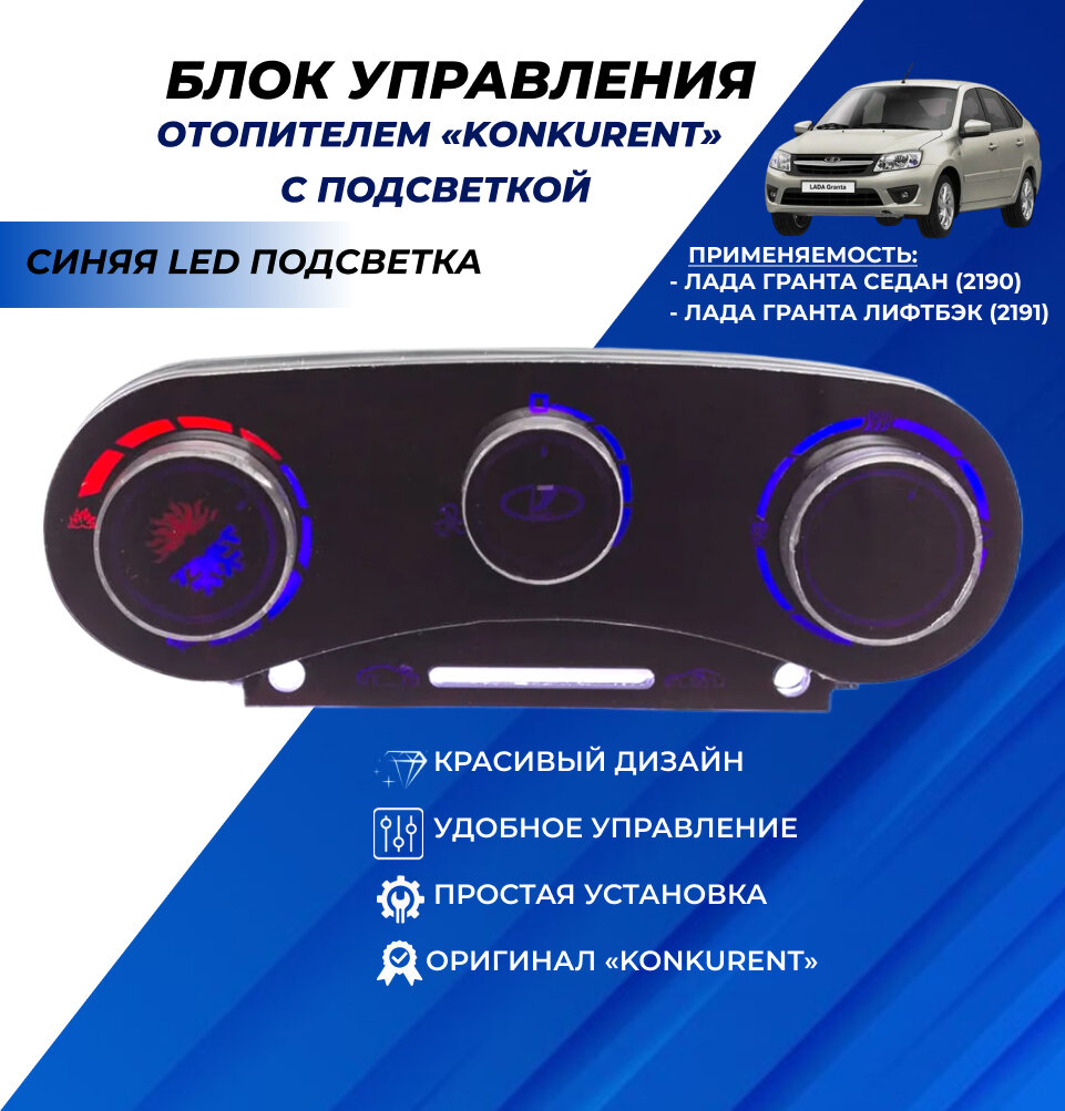 Облицовка блока отопителя Гранта с синей Led подсветкой и ручки управления отопителем на Lada Granta. - это идеальное решение для тех, кто стремится улучшить внешний вид и функциональность своего автомобиля. Облицовка блока отопителя предельно проста в установке и прекрасно подходит для тюнинга, придавая салону вашего автомобиля стильный и современный вид.