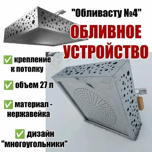 Обливное устройство для бани крепление к потолку объемом 27 литров. Обратите внимание, что отделка этой Обливасту выполнена из металла нержавейки с рисунком "Многоугольники".