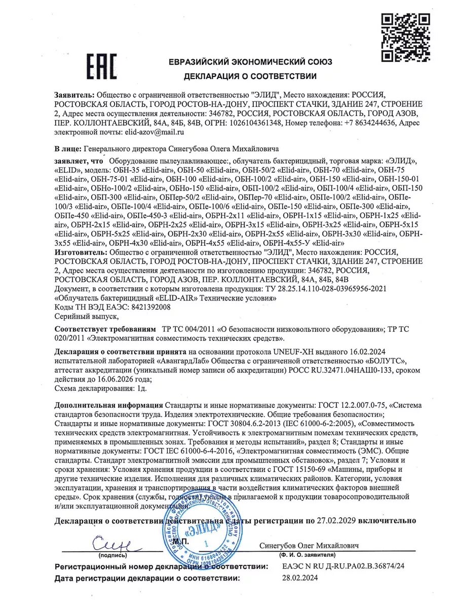 Купить Облучатель бактерицидный настенный ОБН-150 Elid-air, со шнуром, бытовой (2 лампы 30 Вт в комплекте) с доставкой по всей России.
