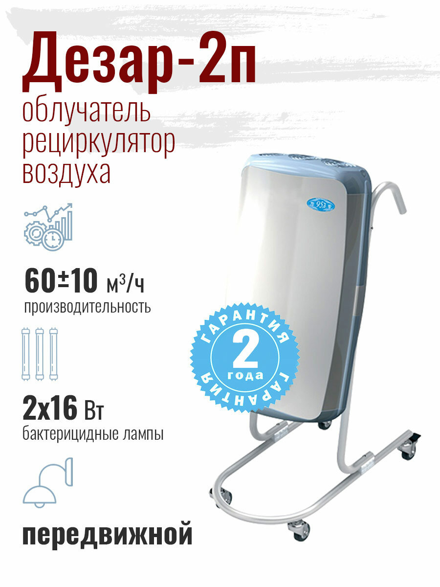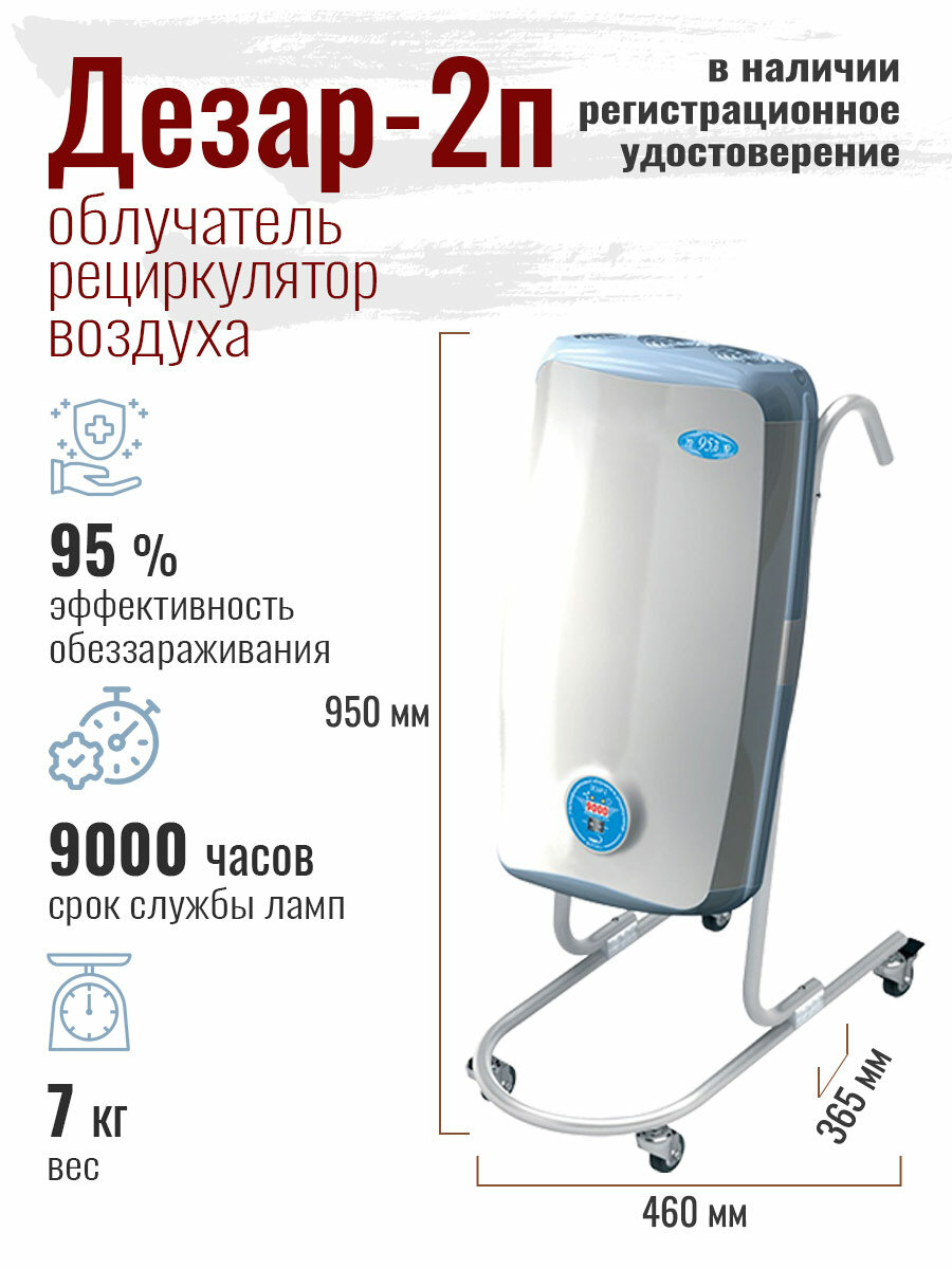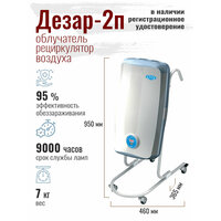 Модель "ДЕЗАР-2п" является наиболее компактной, среди всех рециркуляторов марки "дезар", при этом её бактерицидная эффективность и бесшумная работа позволяет использовать её в квартирах, офисах, приёмных и т. д.