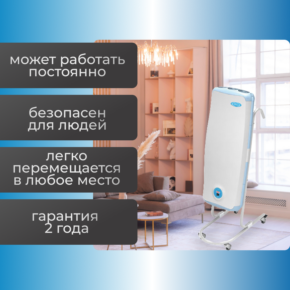 Принцип действия рециркулятора Дезар-4 состоит в следующем — благодаря вентиляторам воздух поступает внутрь корпуса, где безозоновые ультрафиолетовые лампы уничтожают своим излучением 99,9 % бактерий, вирусов, грибков и спор. После этого очищенный воздух возвращается назад в помещение. Дополнительно установлены специальные фильтры для очистки воздуха от мелких механических примесей таких как пыль и пыльца. Эту деталь особенно оценят люди страдающие аллергическими реакциями. Таким образом во время работы облучателя происходит постоянная циркуляция воздуха. Это современная передовая технология, которая разработана и произведена в России. Рециркулятор Дезар-4 передвижной совершенно безопасен для человека и его можно включать в любое удобное время. Так же при необходимости аппарат может работать на постоянной основе - это рекомендуется, если в помещении большая проходимость людей.