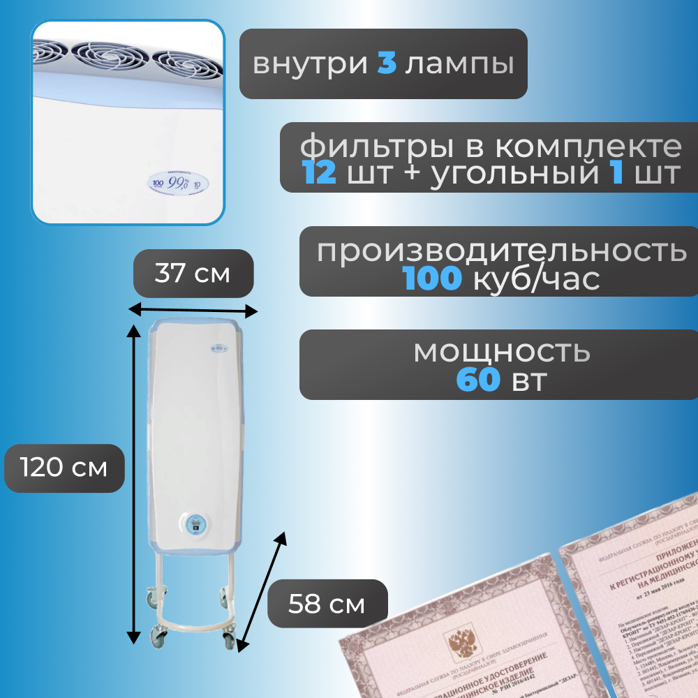 Ультрафиолетовый бактерицидный рециркулятор Дезар-4 передвижной - это аппарат для дезинфекции воздуха в помещении. Дезар-4 - мощный рециркулятор, который предназначен для обработки больших помещений до 50 кв/м. - внутри установлено 3 лампы мощностью 15Вт. Бактерицидный рециркулятор Дезар-4 рекомендован для помещений 2-5 категории, таких как процедурные кабинеты, перевязочные палаты, реанимационные отделения, станции переливания крови. Благодаря своим техническим и медико-биологическим характеристикам - высокой степени обеззараживания - данные рециркуляторы так же рекомендованы для использования в детских учреждениях - садах, школах, яслях и т. д; в учреждениях службы быта и сферы обслуживания - парикмахерских, косметологических и массажных салонах, санаториях и т. д. Данная модель ультрафиолетового рециркулятора - Дезар-4 выполнена в лаконичном корпусе в комплекте со специально разработанной тележкой, что делает Дезар-4 максимально удобным и комфортным в использовании - ультрафиолетовый бактерицидный рециркулятор Дезар-4 легко передвигается в любое нужное место.