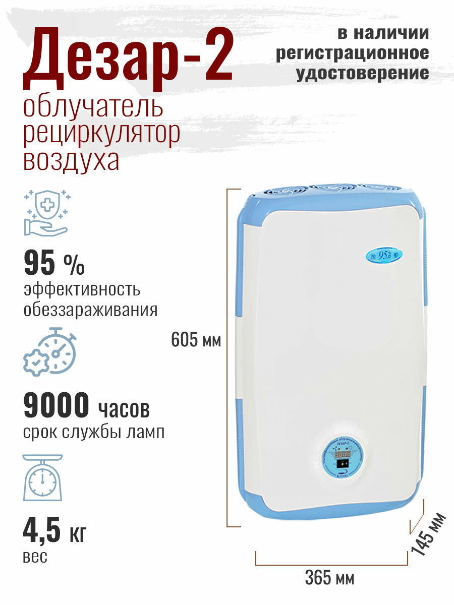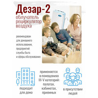 Модель "ДЕЗАР-2" является наиболее компактной, среди всех рециркуляторов марки "дезар", при этом её бактерицидная эффективность и бесшумная работа позволяет использовать её в квартирах, офисах, приёмных и т. д.