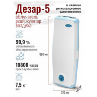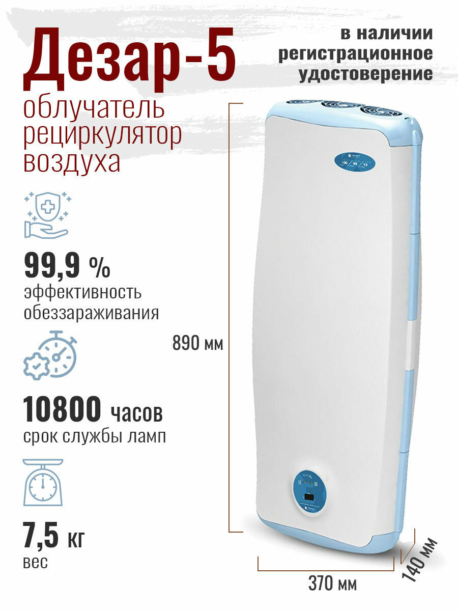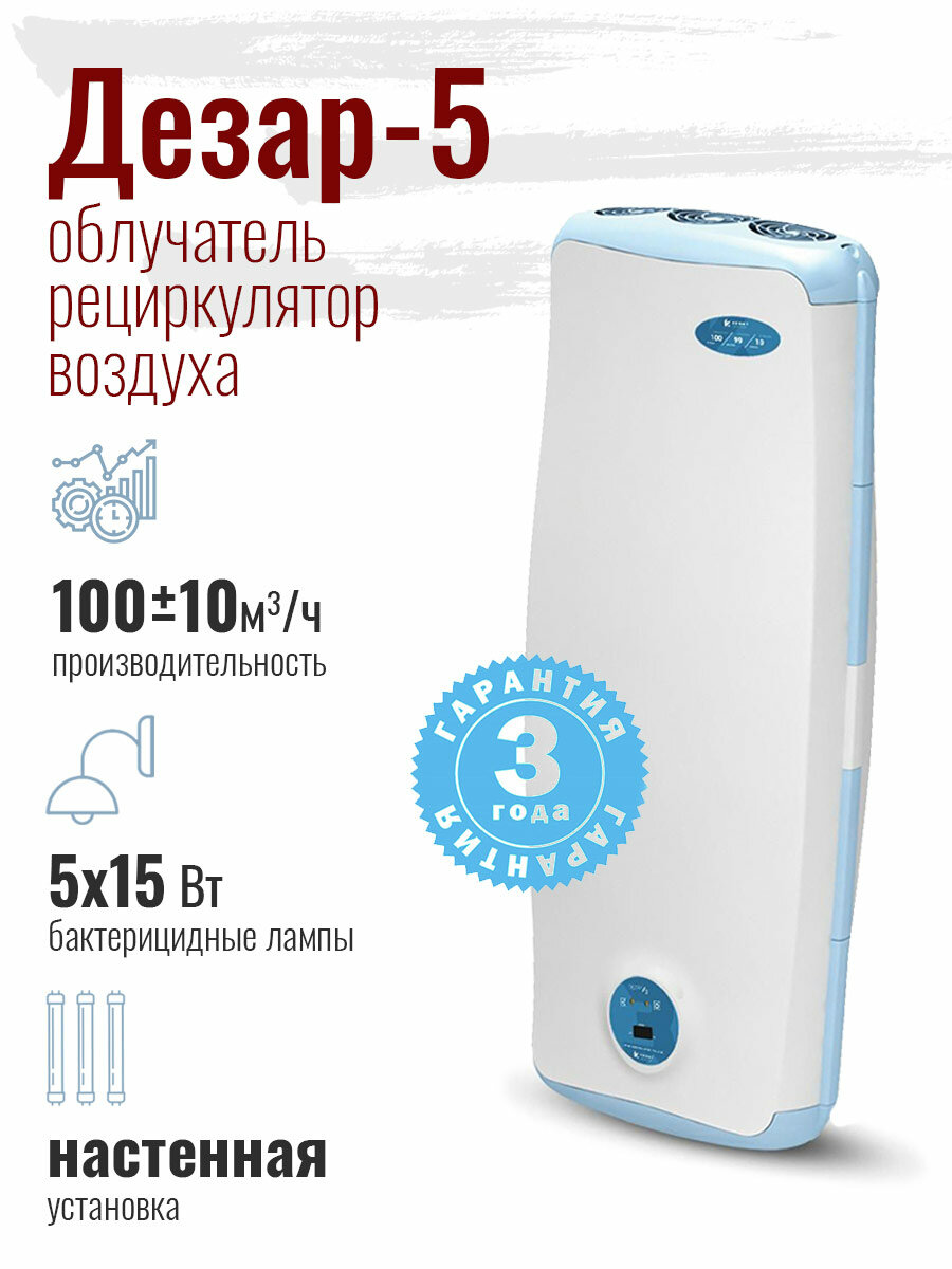 Настенная модель. Наивысшая степень дезинфекции – 99,9 %. Для работы в помещениях категорий I-V. Производительность 100 м3 (кубических метров) в час. Габаритные размеры: 890x370x140 мм. Облучатель-рециркулятор ОРУБн-3-5-«кронт» (ДЕЗАР-5) – это эффективное медицинское устройство для безопасной очистки воздуха от бактерий в помещении. Конструктивные особенности данного аппарата не допускают воздействия ультрафиолетового излучения на людей и животных, а лампы покрыты специальным веществом, предотвращающим выделение озона, вредного для здоровья. Всё это делает бактерицидный рециркулятор «ДЕЗАР-5» максимально безопасным и эффективным в использованииОсобенности и преимущества