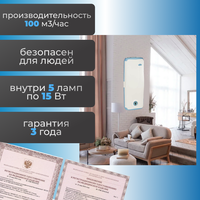 Принцип действия рециркулятора Дезар-5 состоит в следующем — благодаря вентиляторам воздух поступает внутрь корпуса, где безозоновые ультрафиолетовые лампы уничтожают своим излучением 99,9 % бактерий, вирусов, грибков и спор. После этого очищенный воздух возвращается назад в помещение. Дополнительно установлены специальные фильтры для очистки воздуха от мелких механических примесей таких как пыль и пыльца. Эту деталь особенно оценят люди страдающие аллергическими реакциями. Таким образом во время работы облучателя происходит постоянная циркуляция воздуха. Это современная передовая технология, которая разработана и произведена в России. Рециркулятор Дезар-5 Настенный совершенно безопасен для человека и его можно включать в любое удобное время. Так же при необходимости аппарат может работать на постоянной основе - это рекомендуется, если в помещении большая проходимость людей.